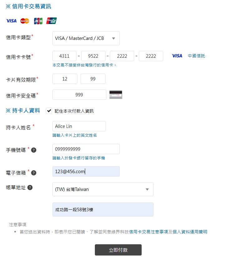 3.1.1 可直接於介面輸入信用卡卡號、有效年月、安全碼、持卡人資料。輸入完後按下畫面最下方的「立即付款」
