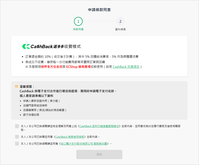 只要您已是 綠界特約會員,即可於綠界廠商後台提出 CashBack 服務申請。申請時需依身分類別準備以下文件,並於申請時上傳提供。