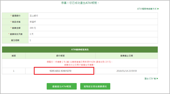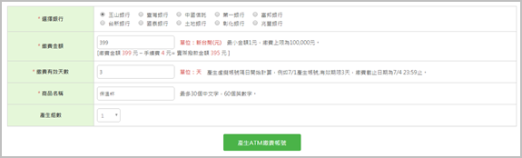(1) 選擇銀行、繳費金額等相關資訊,即可直接產生ATM虛擬帳號。