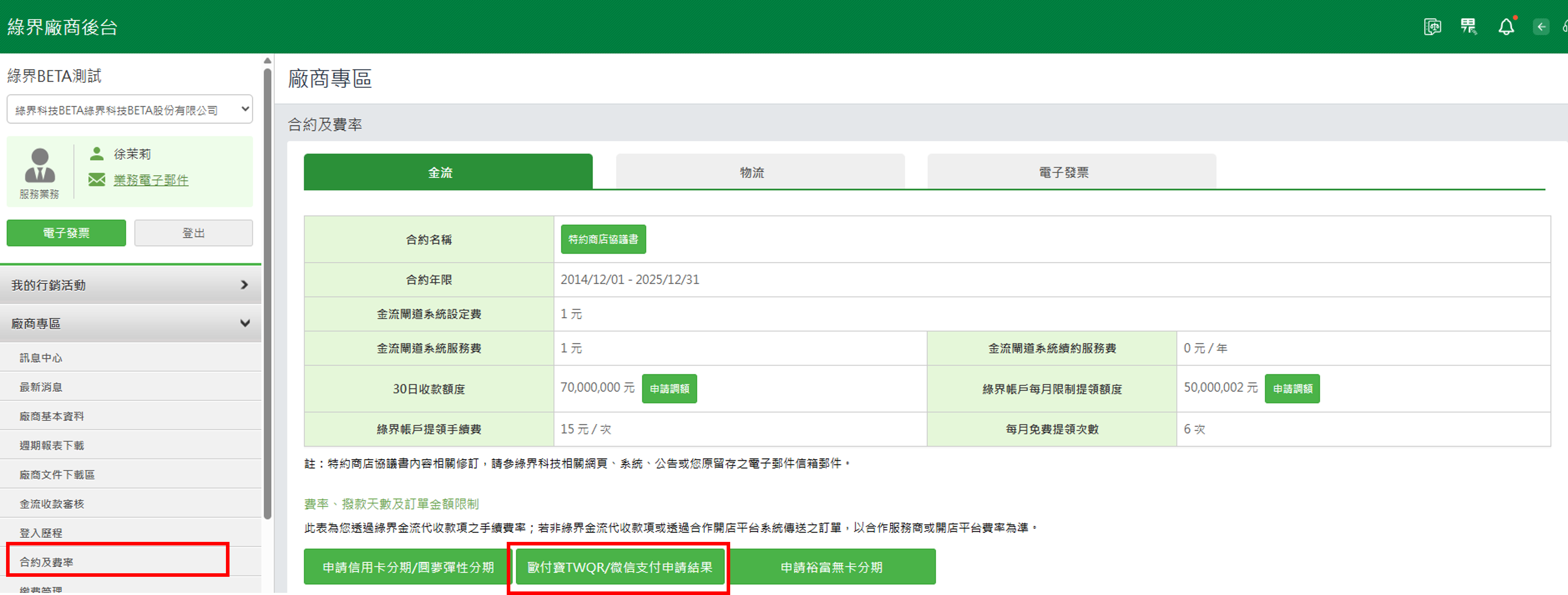Step2:可於廠商後台>廠商專區>合約及費率點選「申請歐付寶TWQR / 微信支付」,進行服務申請。