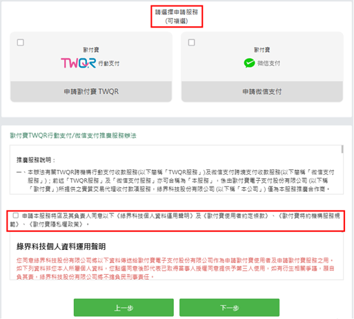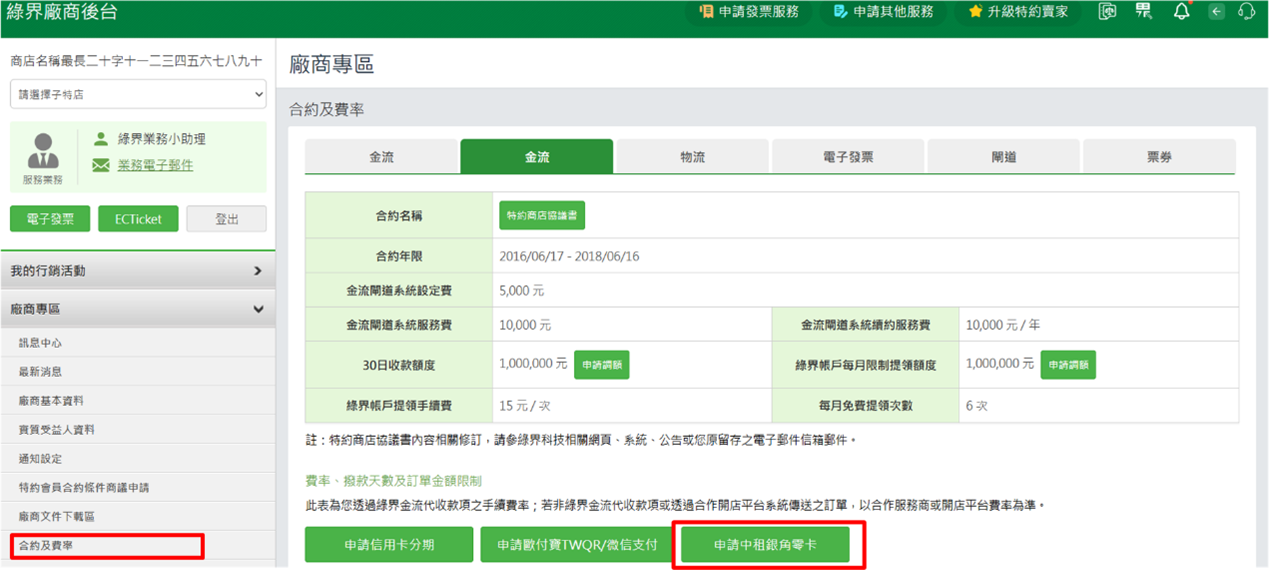 - 若已是綠界賣家,請協助至【綠界廠商後台】申請合約商議,申請流程請參考申請綠界特約賣家(合約商議)