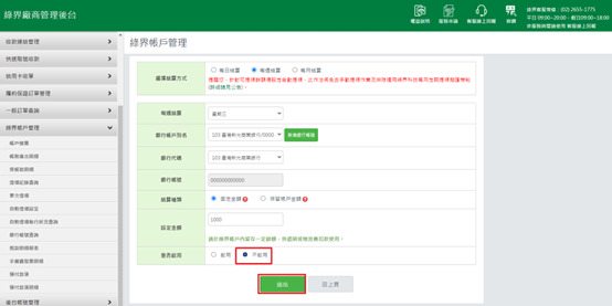 - 固定金額:您可以設定固定提領多少錢至銀行,若綠界帳戶餘額不足就不會提領。