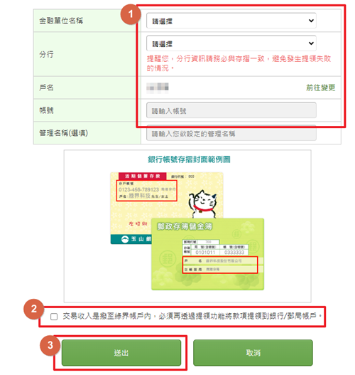 - 分行資訊需與存摺一致,請至提領設定確認您的設定。