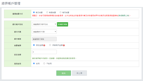 - 固定金額:您可以設定固定提領多少錢至銀行,若綠界帳戶餘額不足就不會提領。