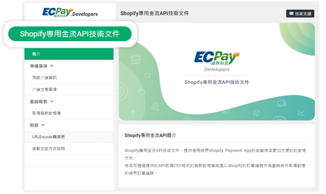技術文件請至 : 開發者中心>綠界串接規格下載>Shopify金流串接 查看「Shopify專用金流API技術文件