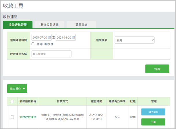 可以 綠界廠商後台>收款工具>收款連結 查詢到所有已經建立的收款連結,也可以建立副本、分享連結、批次操作啟用/停用/刪除連結或列印QR Code。