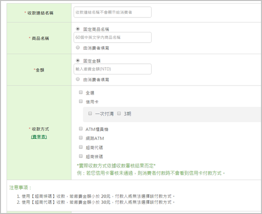 (1) 填寫收款連結的設定資料,以建立收款連結。