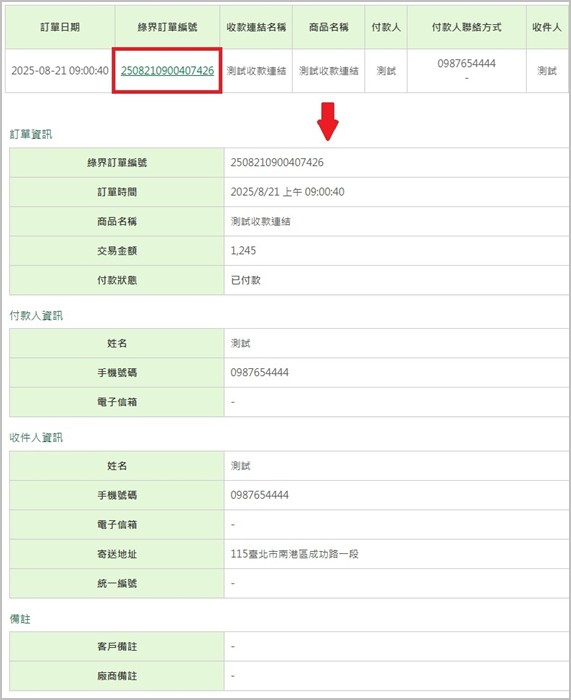 可查詢使用收款連結的訂單,點訂單編號的連結可以檢視訂單明細。
