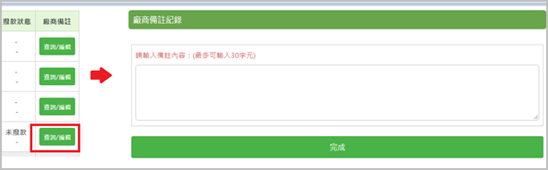 若要針對訂單進行備註,可點選該筆訂單後方的【廠商備註】欄進行編輯。