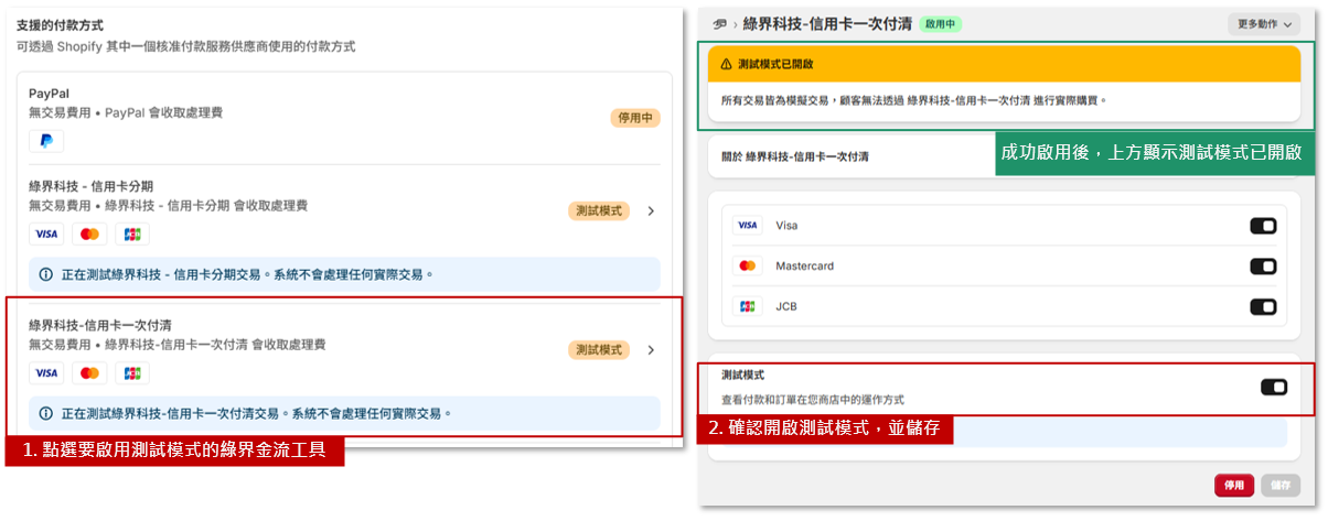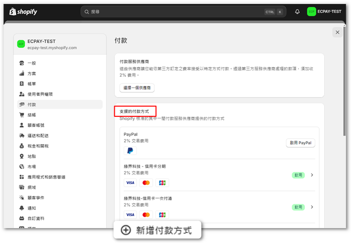 如需啟用 Shopify 測試模式,請至 Shopify後台設定。啟用測試模式後,交易會透過綠界測試環境建立訂單。