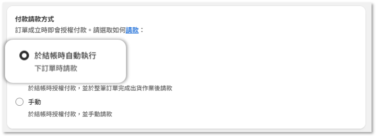 Shopify商店可自行設定請款方式,為避免請款異常,綠界建議您選擇「於結帳時自動執行」。