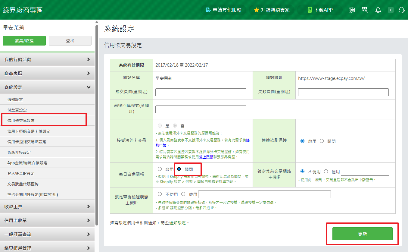 若您想要調整為手動關帳請款,請至 綠界廠商後台 > 系統設定 > 信用卡交易設定,將「每日自動關帳」設定為關閉。
