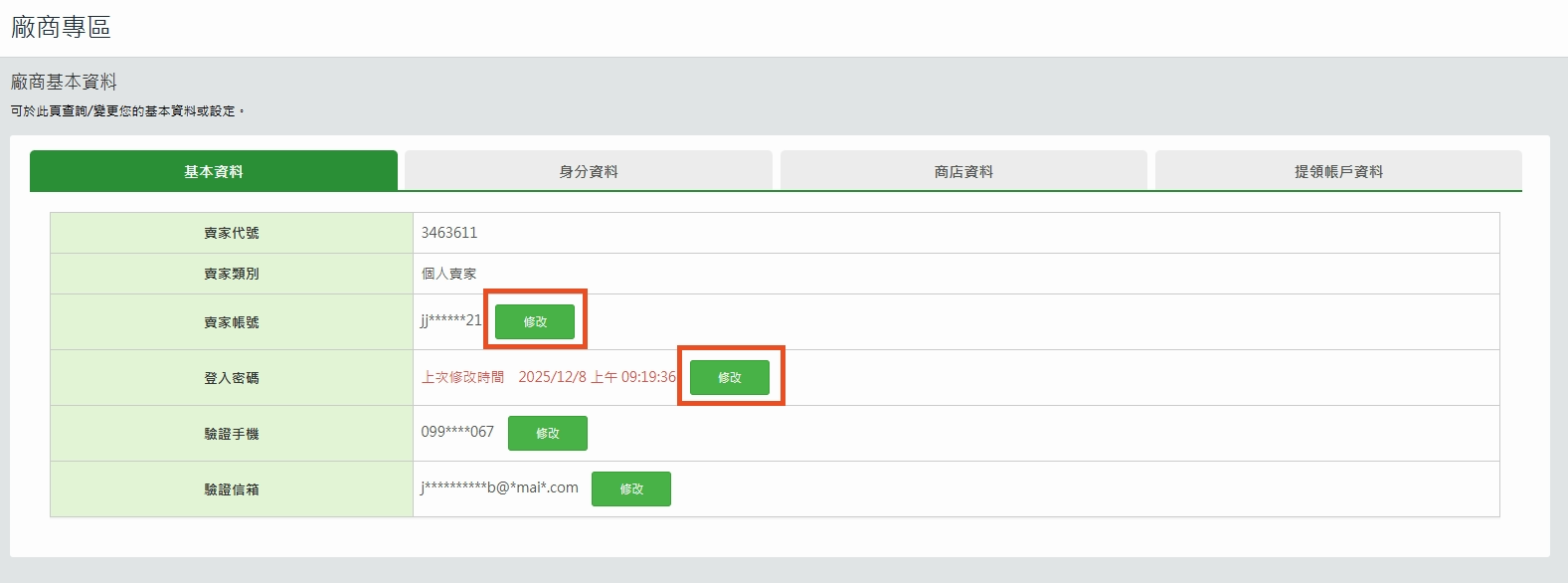 2. 點賣家帳號或登入密碼旁的【修改】按鈕。