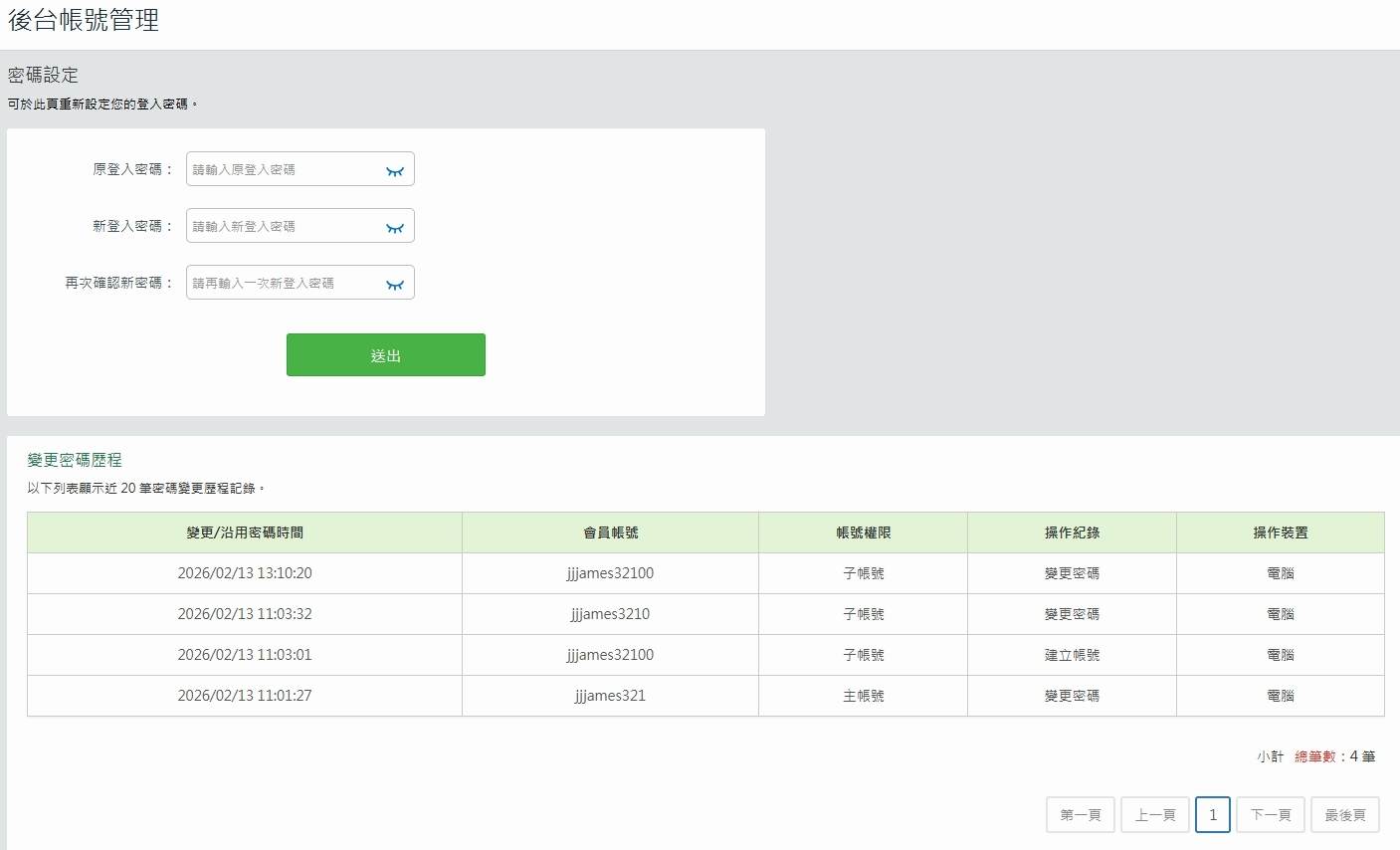 1. 點選「後台帳號管理>密碼設定」即可重設子帳號密碼。