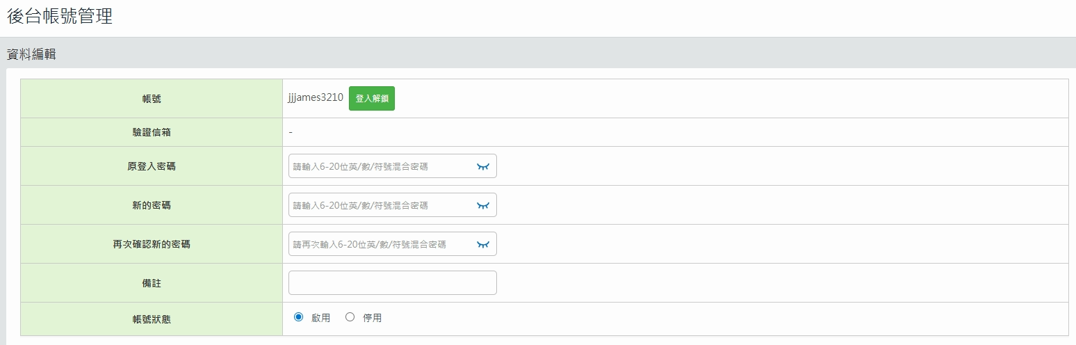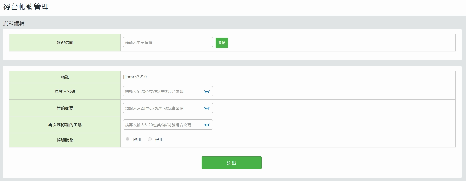 1. 點選「後台帳號管理」,找到您要變更的「子帳號」,點【資料編輯】,即可重設子帳號密碼。